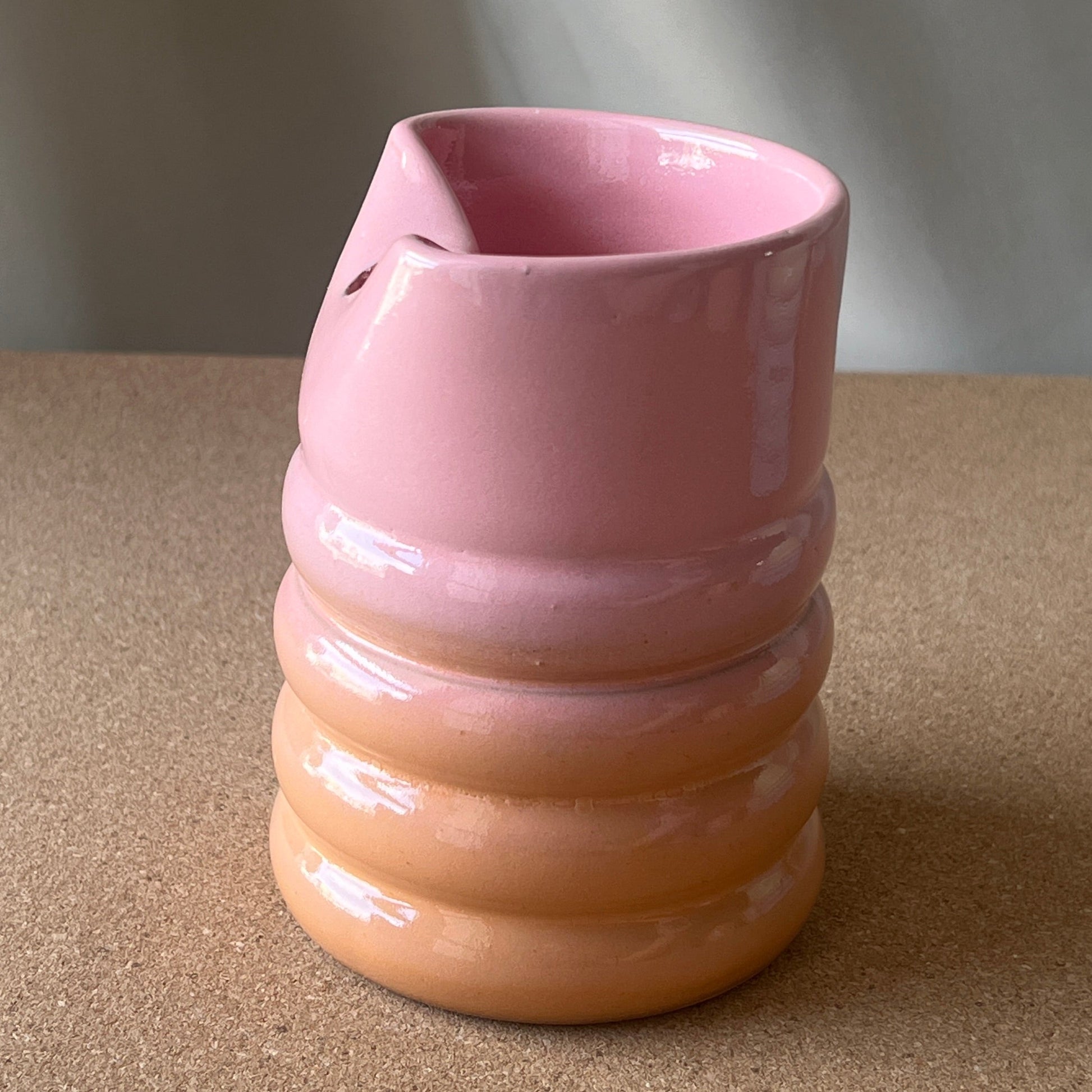 A rare sample edition of our Peach Glow ceramic tumbler. Unlike the original, this one features the shades reversed: a soft pink glaze covers the inside and top half, while a warm orange glaze anchors the base. Handmade from Egyptian pottery clay, this one-of-a-kind tumbler is perfect for collectors or anyone who loves unique, small-batch pottery.
